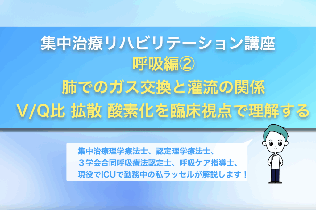 集中治療におけるリハビリテーションの役割 この記事は、大いに私見を含みながら、私自身が日々どのようなことを考えながら重症患者さんに接しているのかをまとめたものです。 したがって、ここで示す内容は厳密なエビデンスの解説というよりも、臨床現場... 集中治療呼吸編②肺でのガス交換と灌流の関係|V/Q比・拡散・酸素化を臨床視点で理解する