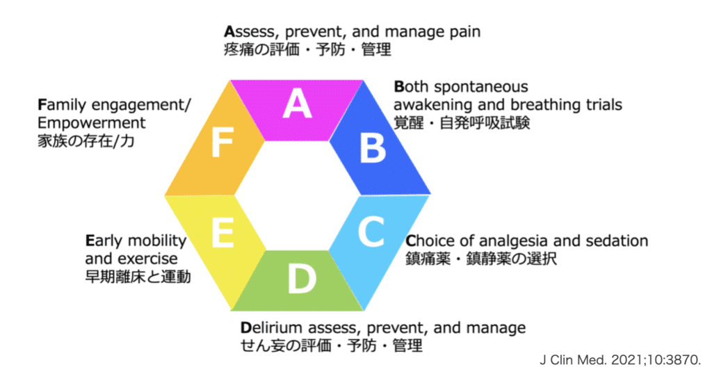 PICSを予防するうえで、いまや世界的に広く推奨されているのが ABCDEFバンドル です。これは集中治療の現場で実践すべきケアを体系化したもので、単一の職種や治療にとどまらず、多職種で連携しながら患者さんを包括的に支援する枠組みといえます10)12)。