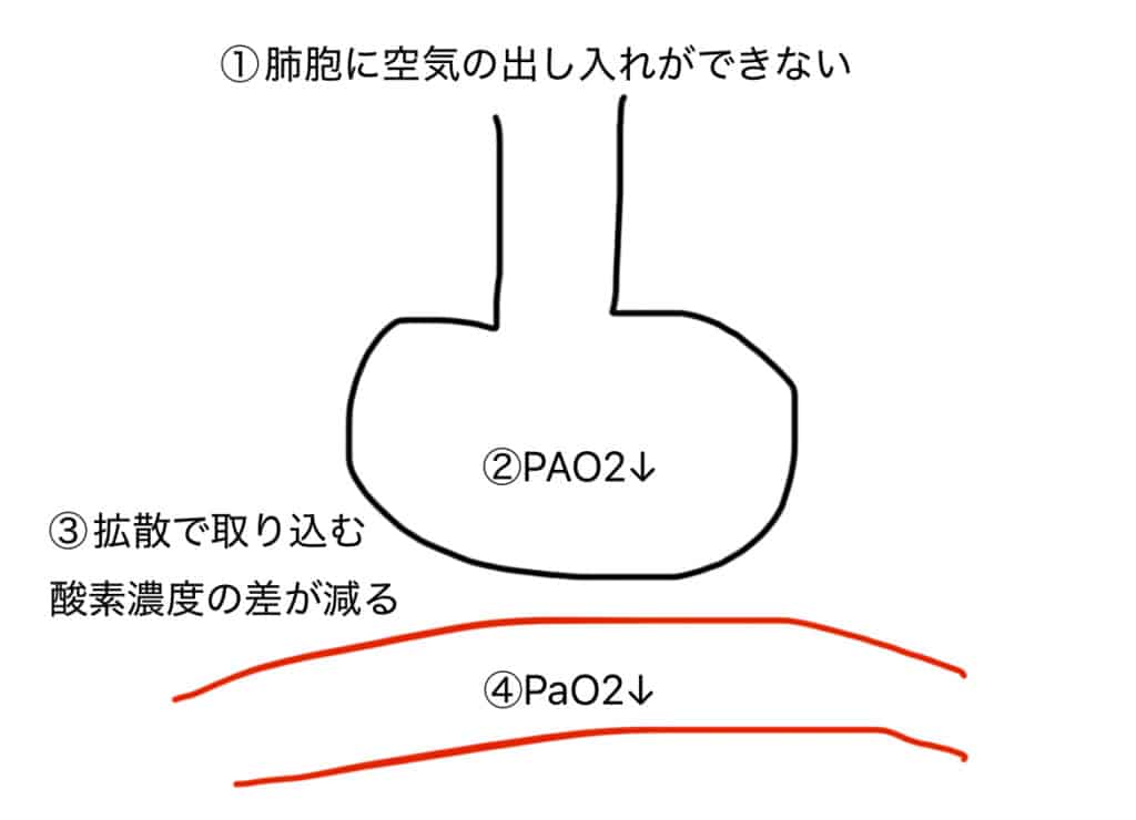 肺胞換気量そのものが減ることで、酸素の供給が制限されるという病態です。
